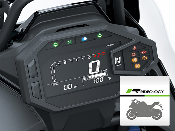 The KLE500 features a high-contrast full LCD instrument panel with a modern, rider-friendly layout. A bar-style tachometer positioned above the speedometer ensures clear readability, while comprehensive information is displayed, including speed, engine rpm, gear position, fuel level, distance, and fuel consumption.