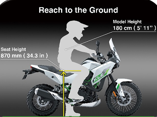 The slim fuel tank and smooth bodywork facilitate weight shifting and precise control on dirt surfaces. A well-padded seat supports long-distance comfort, with a shape that allows easy fore-and-aft weight transfer. The 870 mm seat height balances a confident reach to the ground with a relaxed knee bend.
