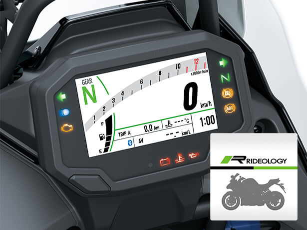 The KLE500 features a high-contrast full LCD instrument panel with a modern, rider-friendly layout. A bar-style tachometer positioned above the speedometer ensures clear readability, while comprehensive information is displayed, including speed, engine rpm, gear position, fuel level, distance, and fuel consumption.