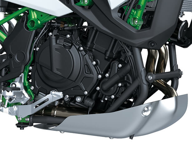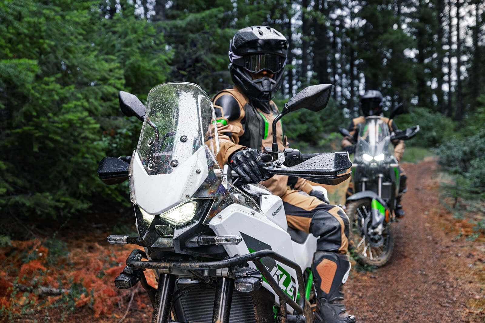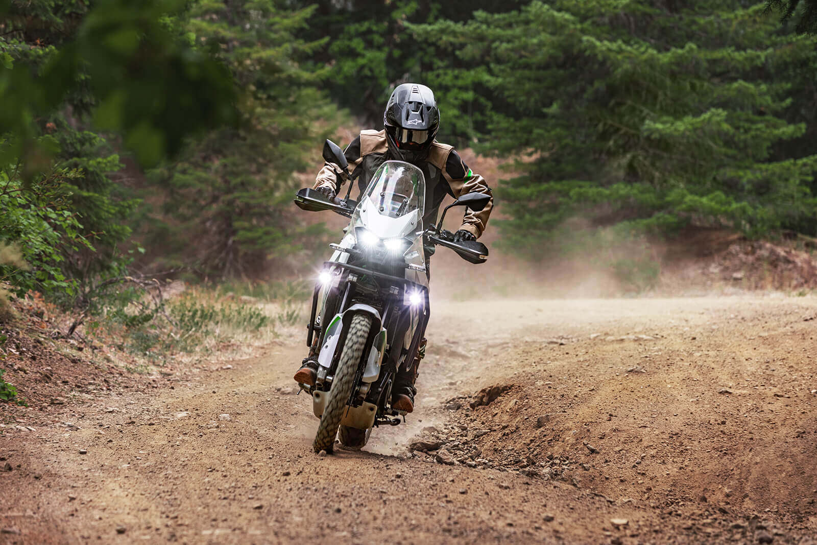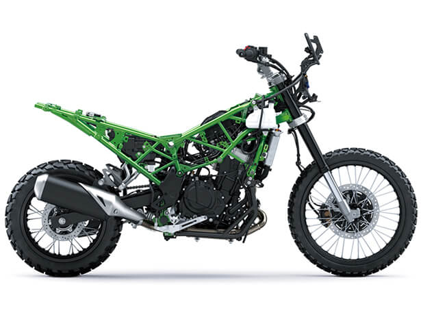 Street-bike elements such as the stepped seat, low-mounted front fender, and headlight design reflecting Kawasaki’s family identity add familiarity. The compact triple LED headlight combines street-sport character with rally inspiration while delivering excellent lighting performance. Slim side covers, a compact fuel tank, and KX-inspired design lines give the bike a light, agile appearance that supports rider mobility and control.