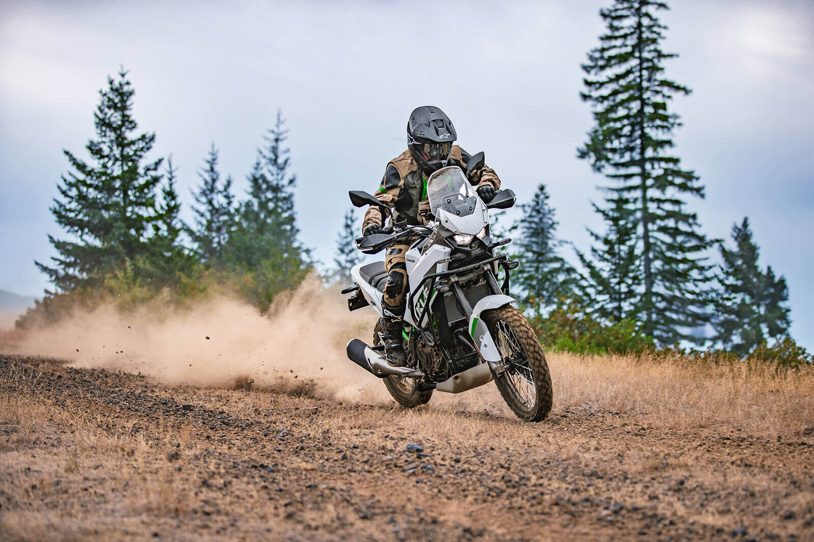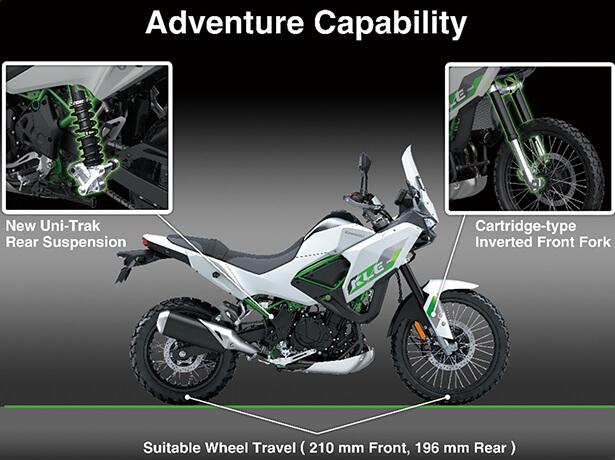 Riding on unpaved roads requires suspension that delivers precise control while balancing ride comfort with excellent bump absorption on rough surfaces. A specially designed front fork offering strong on- and off-road performance works together with the New Uni-Trak rear suspension to provide ample wheel travel, inspiring confidence regardless of the chosen route.